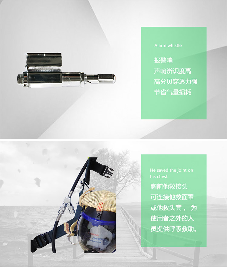 | 產(chǎn)品特點(diǎn): | 配備無線傳感器式平視顯示裝置,壓力平視顯示裝置可分三段顯示氣瓶?jī)?nèi)的壓力范圍,綠燈常亮代表氣瓶壓力在10~30MPa之間,黃燈常亮代表氣瓶壓力在6~10MPa之間,當(dāng)氣瓶壓力在6 MPa以下時(shí)紅燈一直閃亮, 并且開始振動(dòng)。配備腰間他救接口,為使用者之外的人員提供呼吸救助。 |