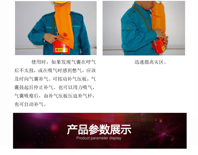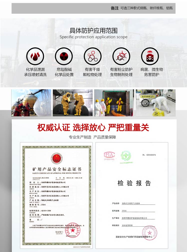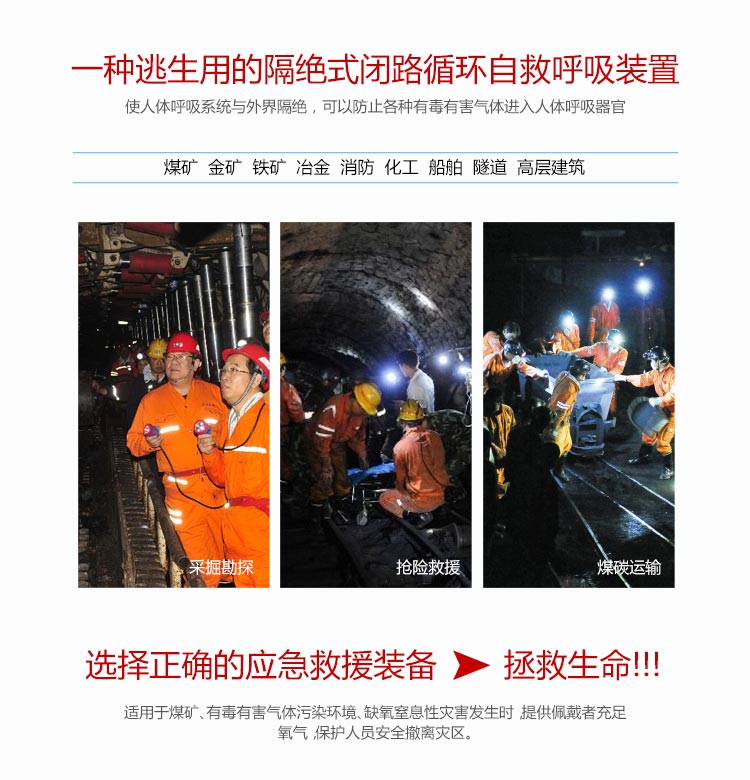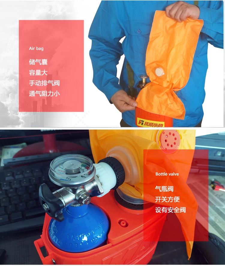 適用范圍:適合在有毒有害氣體污染環(huán)境、或缺氧窒息性災(zāi)害發(fā)生時(shí)使用,例如礦山自救逃生、高層樓宇逃生等,同時(shí)也可在石油化工、隧道工程等。