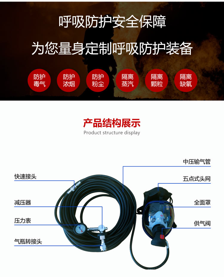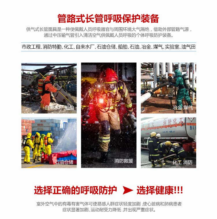 適用范圍:適合在有毒有害氣體污染環(huán)境、或缺氧窒息性災害發(fā)生時使用,例如礦山自救逃生、高層樓宇逃生等,同時也可在石油化工、隧道工程等。